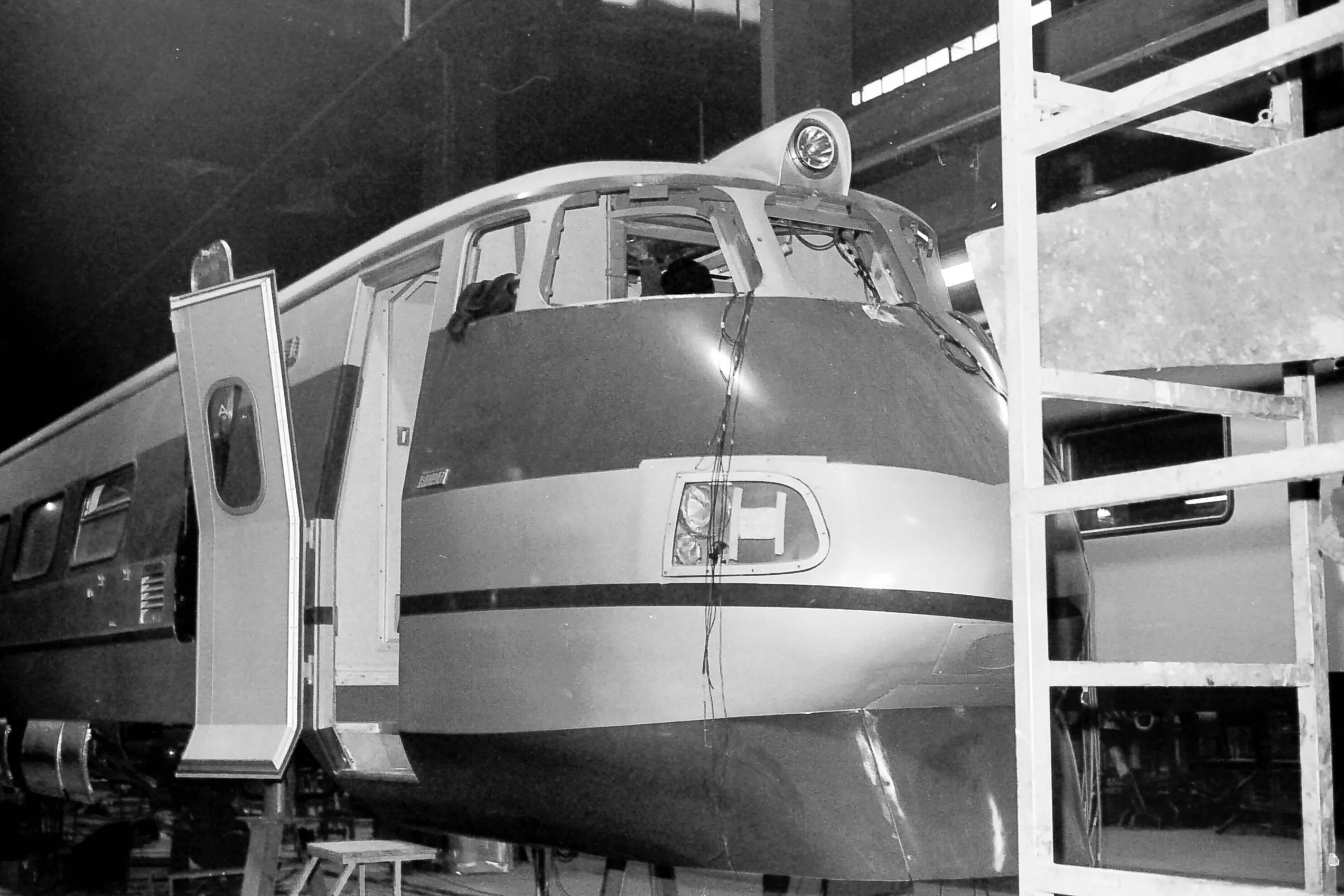 The head element of the first traction unit of the ETR.401 under construction in the Savigliano plant of FIAT Ferroviaria on December 12th, 1974.