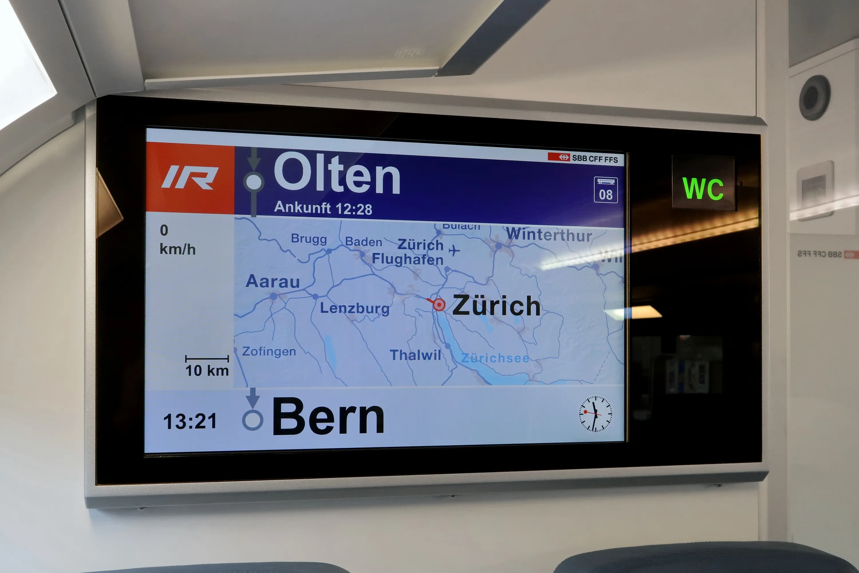 The screens for the passengers show more information than before. The next stop is in Olten, and Bern is the destination. On the map can be seen that the train is still in Zurich (speed zero). The screen automatically switches between standard and new extended display.