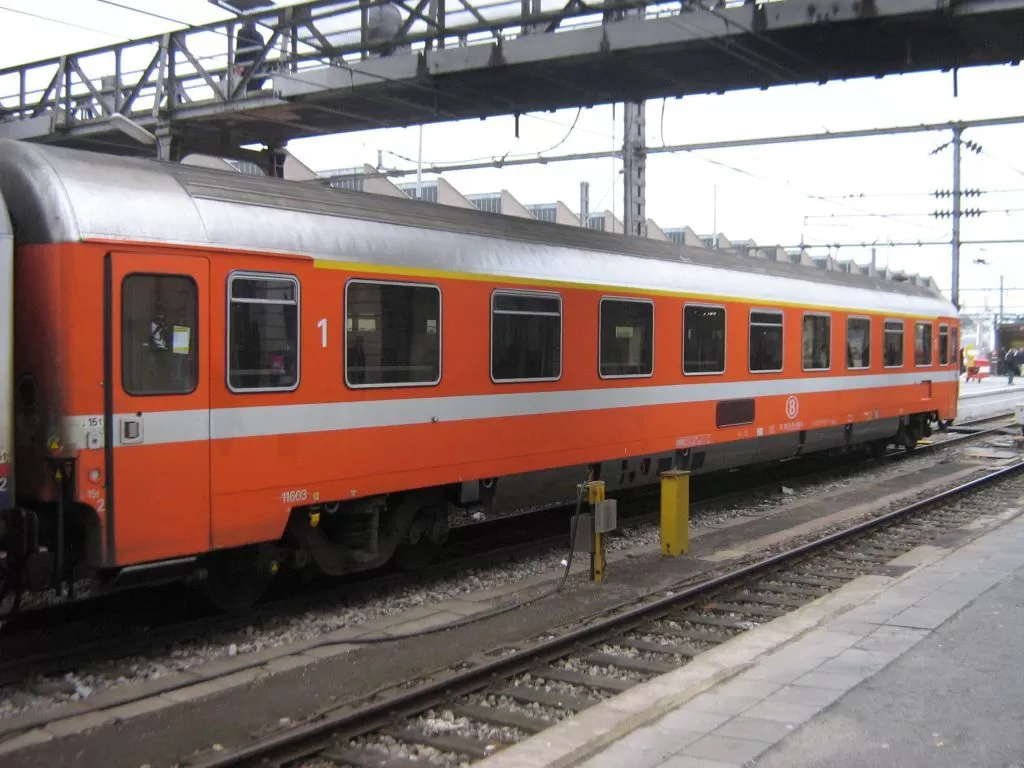 Eurofima 1st-class (I6-A) car of SNCB-NMBS, still in original C1 livery, seen awaiting departure on IR 118 to Liers at Luxembourg-Ville (Stat Lëtzebuerg).