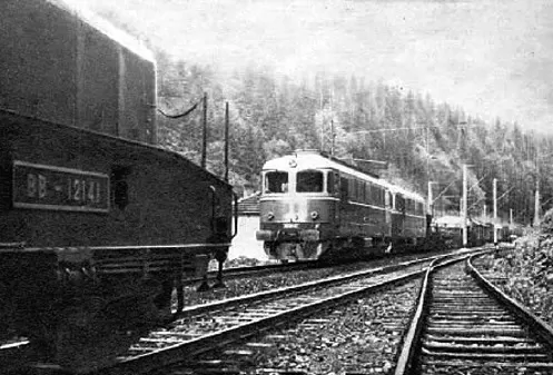 BB-12141 electric locomotive during trials for the Romanian State Railways (CFR) on the Brasov to Predeal section in 1963. On the opposite line, a freight train pulled by 2x 060-DA diesel locomotives.